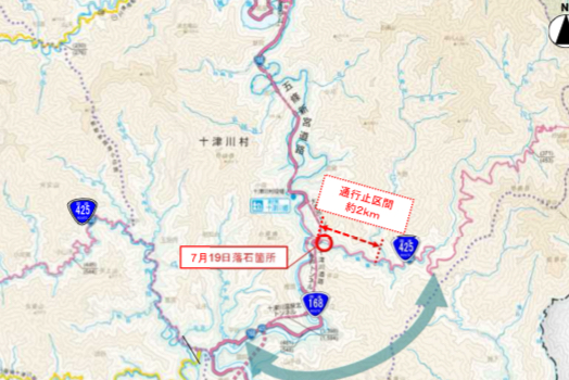 ナライチ コース上の国道425号線で崖崩れのために通行止めが発生しています。